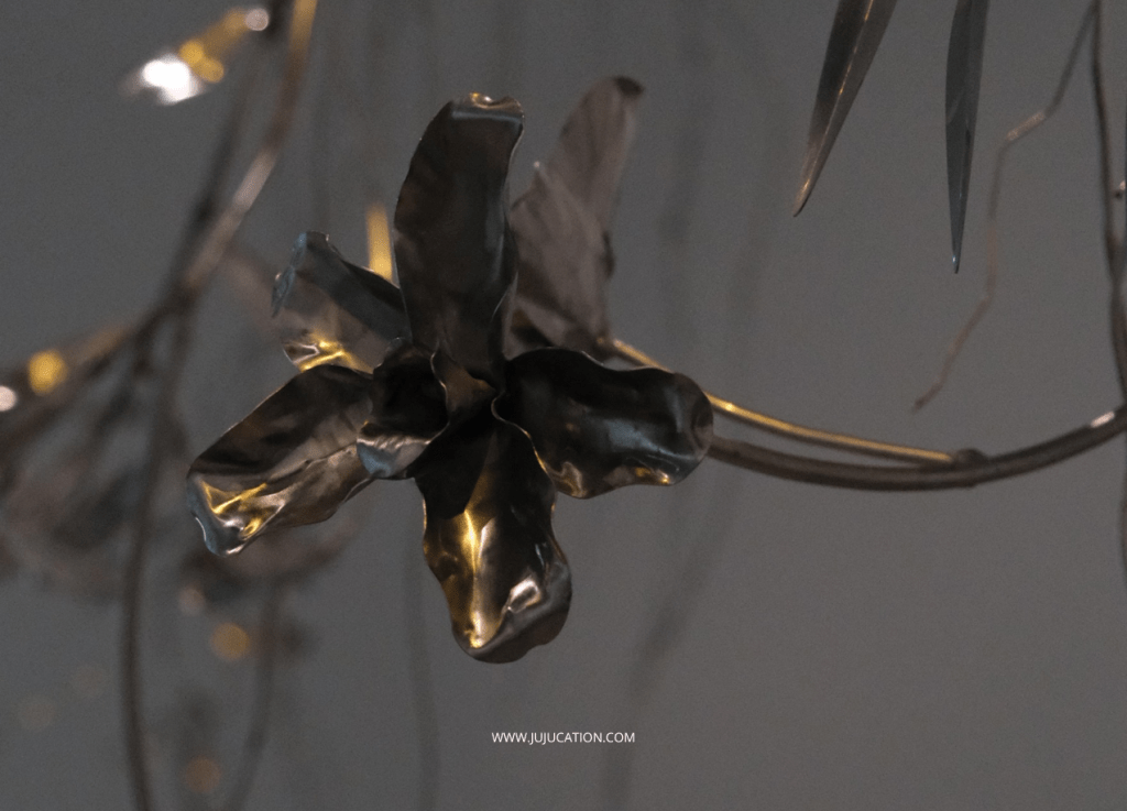 Álvaro Urbano’s Garden City (Orchidaceae) offers a warmer kind of strange. He’s populated the gallery with sculptural plants, fake orchids and cash crops rendered entirely in stainless steel, their metallic forms catching and reflecting the shifting light from Huyghe’s piece. The work references 19th-century botanical illustrations commissioned by British colonial officer William Farquhar, and it layers that history with Singapore’s modern use of orchids as diplomatic gifts, a tool of soft power dressed up as nature.