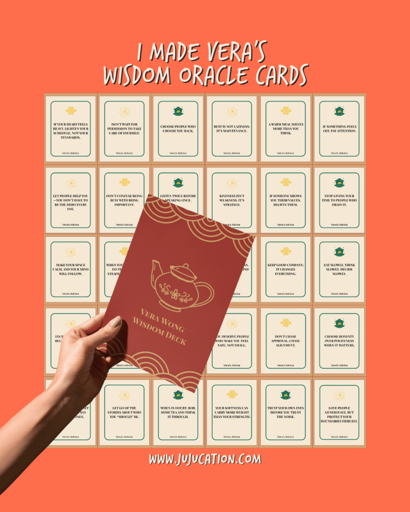 Create a Canva-designed wisdom card deck featuring Vera-isms. Advice that’s firm but caring, slightly judgy but deeply practical. The kind of thing Vera would say while handing you tea you didn’t ask for but absolutely need.